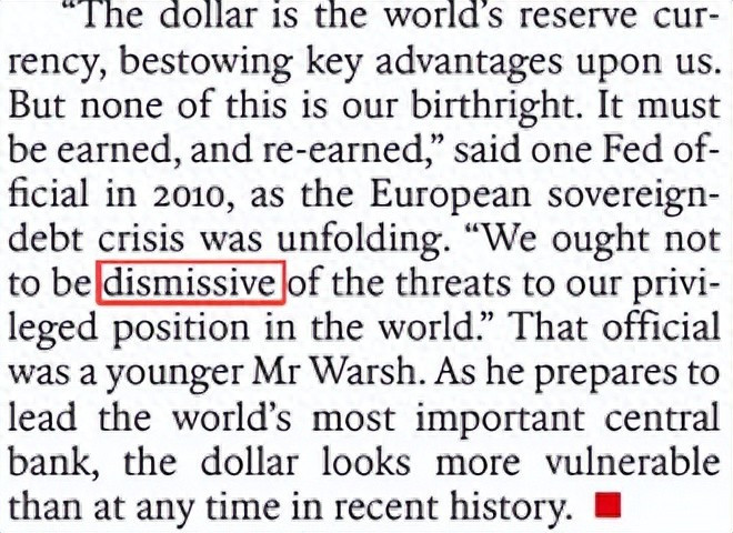 “The dollar is the world's reserve currency, bestowing key advantages upon us. But none of this is our birthright. It must be in earned, and re-earned,”said one Fed official in 2010, as the European sovereign-debt crisis was unfolding.“We ought not to be dismissive of the threats to our privileged position in the world.”That official was a younger Mr Warsh. As he prepares to lead the world's most important central bank, the dollar looks more vulnerable than at any time in recent history.